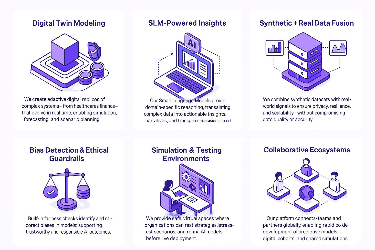 Custom Synthetic Datasets Creation: Using advanced AI models, BIOSYNTEL creates synthetic datasets that mimic real-world data attributes but do not contain any real individual's information. This service is crucial for industries like healthcare, where patient data privacy is critical.Data Augmentation: Enhancing existing datasets with synthetically generated data to improve model training outcomes, especially in cases where real data is scarce, biased, or imbalanced.Anonymization Services: Converting sensitive real-world datasets into anonymized versions, allowing for safe data sharing and analysis without privacy concerns.Bias Detection and Correction: Using synthetic data to identify and correct biases in AI models, ensuring fair and ethical AI outcomes across all applications.Simulation Environments for Testing AI Models: Providing virtual environments populated with synthetic data for companies to safely test and refine their AI models' performance before real-world deployment.